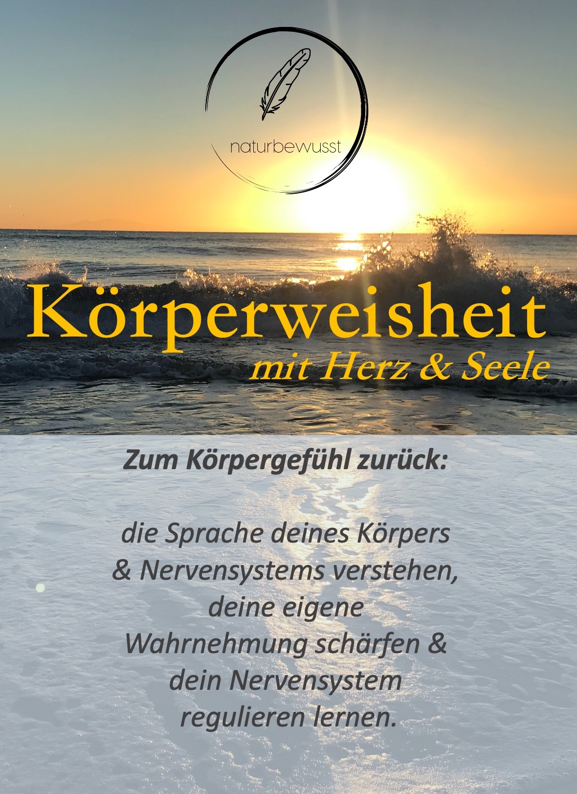 In meinem Kurs „Körperweisheit – mit Herz & Seele“ lernst du die verschiedenen Wahrnehmungsebenen deines Körpers zu erkennen, bekommst Basisinformationen zum autonomen Nervensystem, um die Funktionsweise zu verstehen, lernst die Trauma-Antworten in deinem Alltag zu tracken und bekommst einige simple & wirkungsvolle Tools für den Alltag.