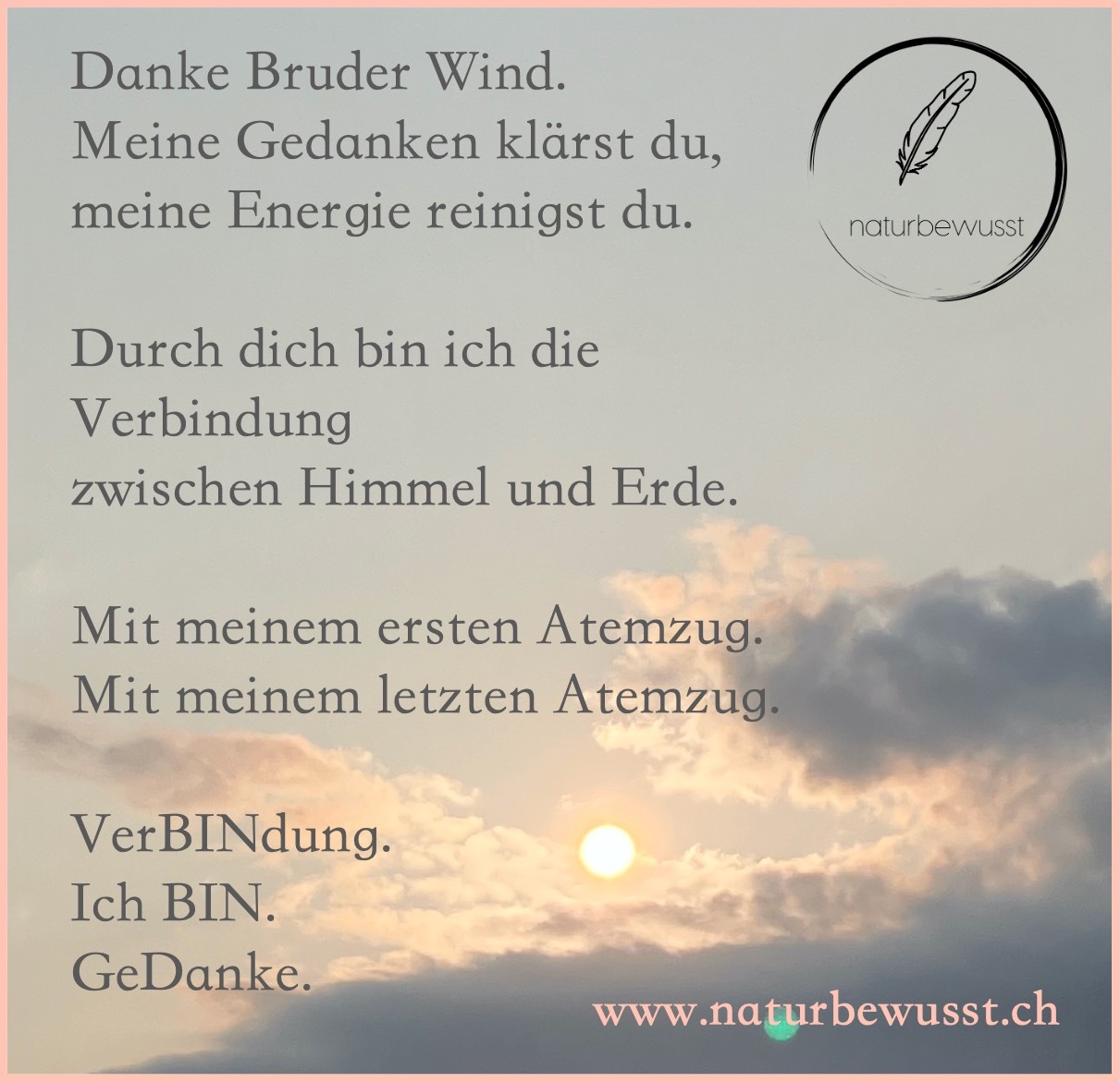 Bevor wir zum Schluss kommen, wo die Meditation «Kraft der 4 Winde» auf dich wartet, hier noch ein paar Worte zum Bruder Wind. Eine Einladung, diese Worte zu fühlen und ganz bewusst zu lesen.
