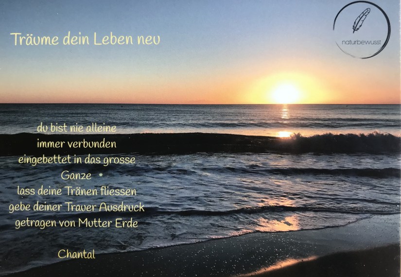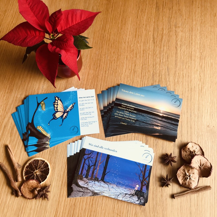 3 verschiedene Sujets: Alles hat seine Zeit – Träume dein Leben neu – Wir sind alle verbunden Format 105 x 148mm Bezahlmöglichkeiten: Twint oder Bankverbindung Versand nach Erhalt der Zahlung
